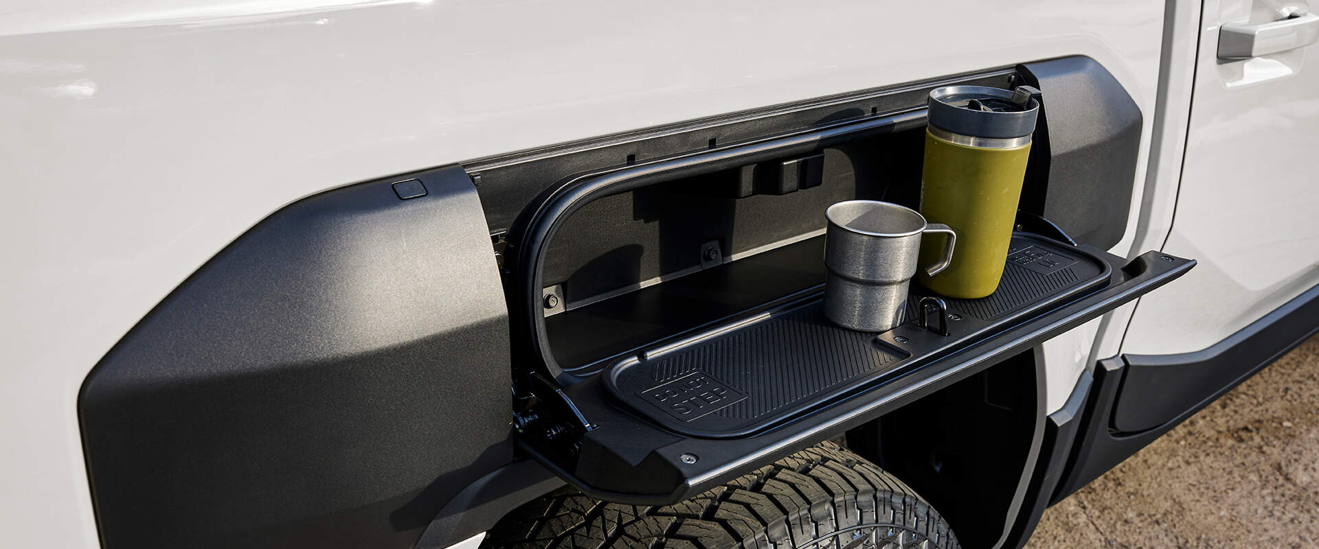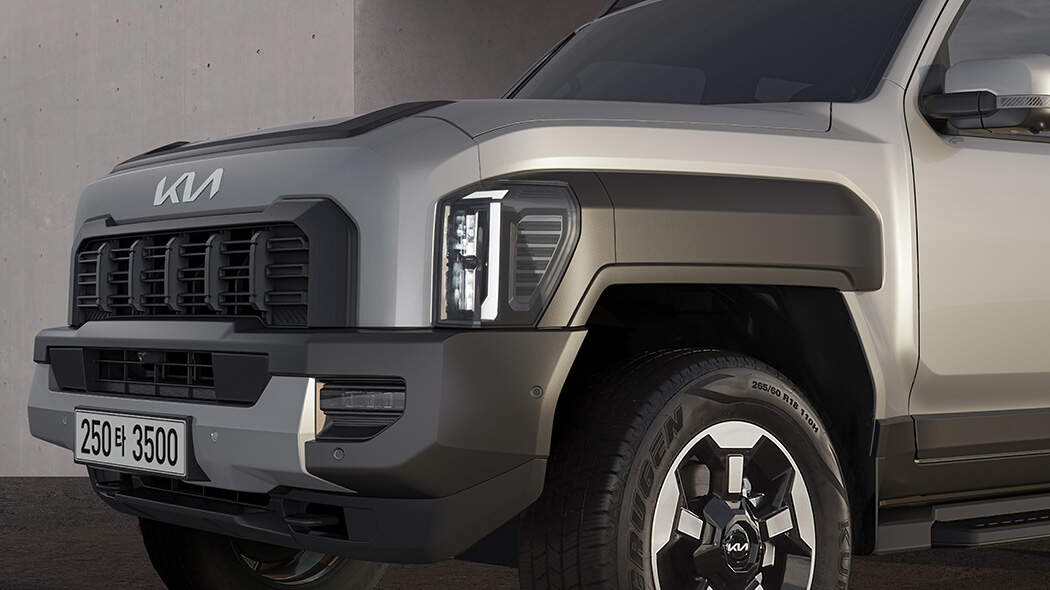 타스만 외관은 기아의 디자인 철학을 반영했습니다. 전면부의 타이거 페이스 디자인은 기아의 상징이며, 가로로 긴 라디에이터 그릴과 수직형 램프는 강인한 인상을 줍니다. 픽업트럭 특유의 듬직함과 세련됨이 조화롭게 어우러진 모습입니다. 측면은 45도 각도로 다듬어진 모서리가 특징이며, 후면에는 코너 스텝이 적용되어 적재 공간 이용 편의성을 높였습니다. 테일게이트 핸들은 디자인에 자연스럽게 녹아들었습니다.