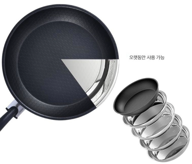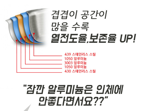- 구조 : 통5중 바닥 (스테인리스 외부 + 알루미늄 등 중간층 + 인덕션 대응 베이스)
