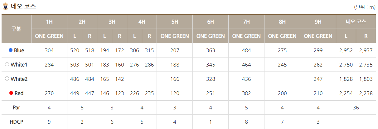 - 네오 코스: 가장 도전적인 코스로, 고저차가 크고 언듈레이션이 많아 집중력이 많이 요구됩니다.