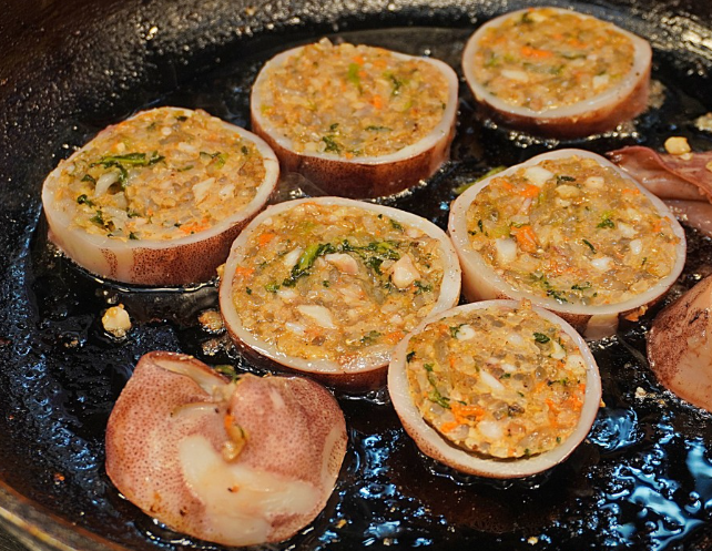 철판에서 바삭하게 구워내 고소한 누룽지 향을 살리고, 오징어 속에는 곡물과 야채가 꽉 차 있어 식감과 풍미가 뛰어납니다.