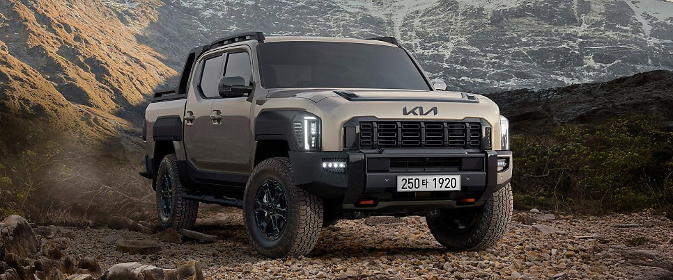 측면부는 픽업트럭 특유의 웅장함을 드러내며, 펜더 부분의 '사이드 스토리지'는 디자인 포인트와 실용성을 동시에 제공합니다. 후면부에는 KIA 로고가 음각으로 새겨진 도어 트렁크 디자인이 적용되었고, '타즈만' 레터링은 트림에 따라 다르게 적용될 예정입니다.