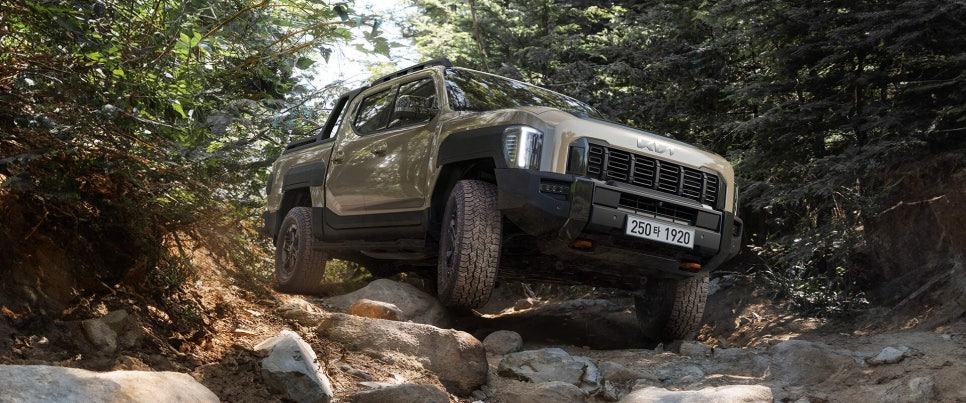 측면부는 픽업트럭 특유의 웅장함을 드러내며, 펜더 부분의 '사이드 스토리지'는 디자인 포인트와 실용성을 동시에 제공합니다. 후면부에는 KIA 로고가 음각으로 새겨진 도어 트렁크 디자인이 적용되었고, '타즈만' 레터링은 트림에 따라 다르게 적용될 예정입니다.